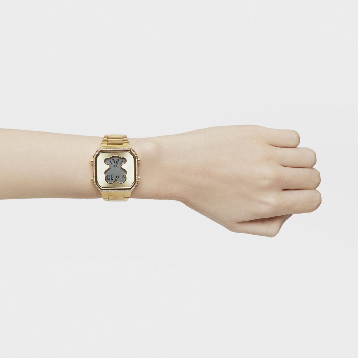 Reloj digital D-BEAR con brazalete de acero IPG dorado y bisel con 80 zirconitas cubicas CZ engastadas en carril. Diámetro caja: 36,5 x 44,8 mm. Funciones: hora, minutos, segundos, día, mes i día de la semana, cronógrafo 1/100 segundos y alarma. Impermeable a 3 ATM. Batería: 3V litio CR2016 / 1,69 gramos (litio 0,025 gramos). Cristal: vidrio endurecido plano con forma de oso. Cierre desplegable con pulsadores.